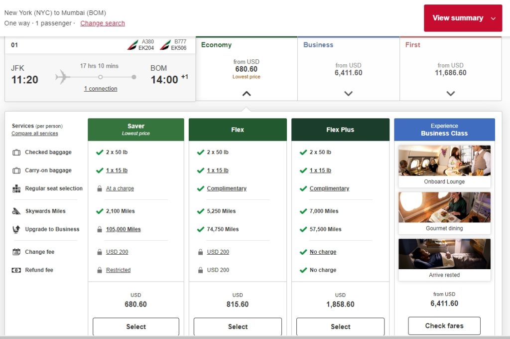 Book Emirates Economy Flex Fare using Ultimate Rewards. This costs 54,372 points at 1.5x redemption.